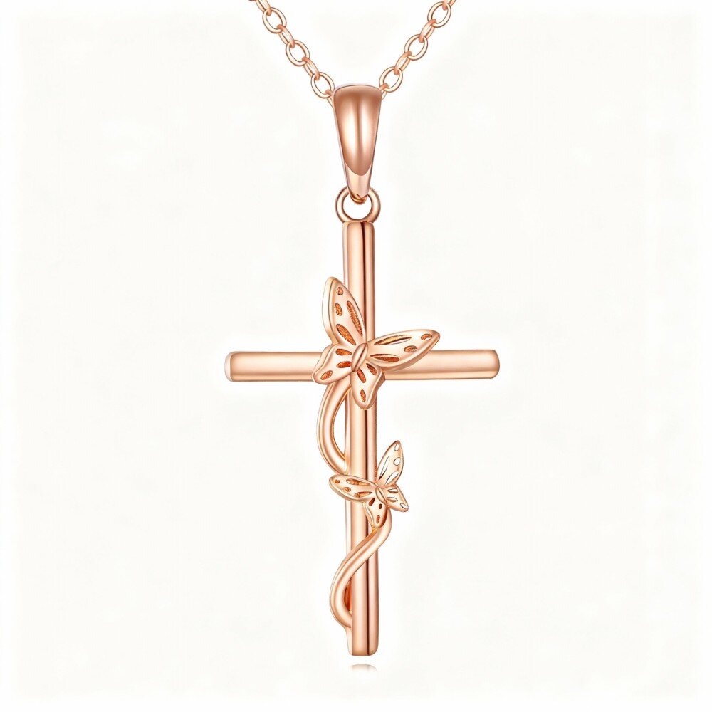 Ontdek de perfecte mix van tijdloze elegantie en modern design in onze 10K Rosé Gouden hanger ketting in vlinder- en kruisontwerp.