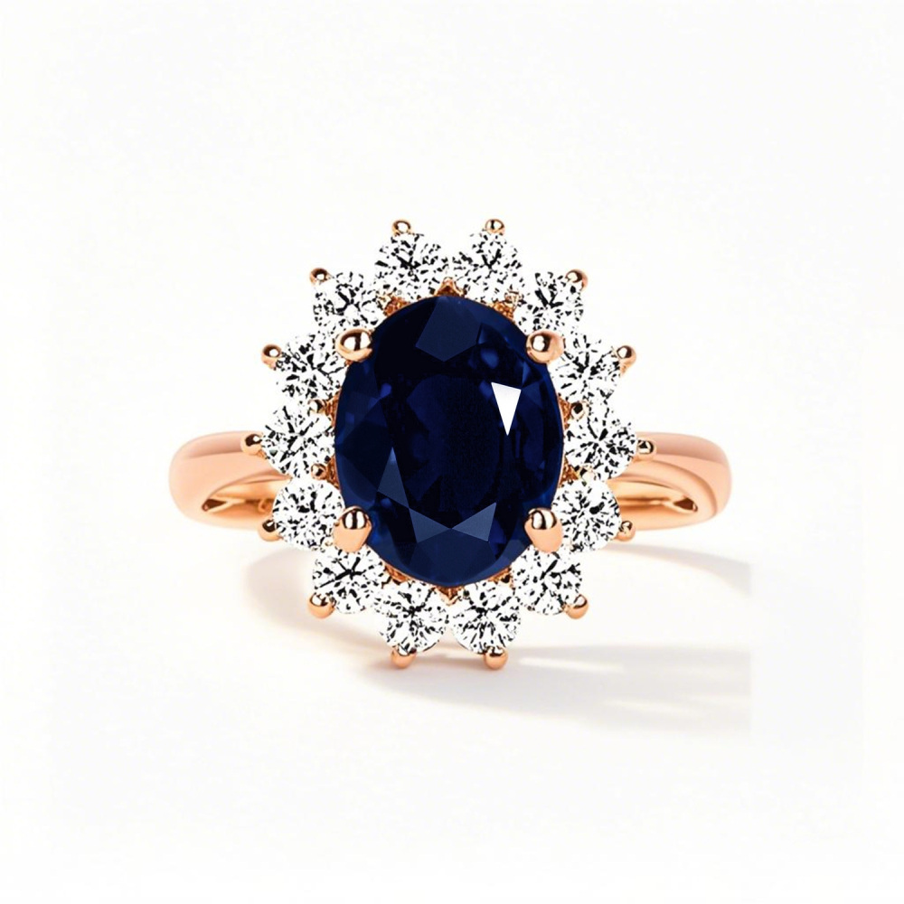 Deze prachtige ring is exclusief ontworpen voor vrouwen die de schoonheid van gepersonaliseerde sieraden waarderen. Het betoverende roségoud schittert prachtig tegen het rijke blauw van de saffier, terwijl de halo van moissaniet-stenen aan de zijkanten een extra laagje schittering toevoegt, waardoor alle ogen op haar gericht zijn wanneer ze dit meesterwerk draagt. Perfect voor verlovingen of speciale gelegenheden: deze ring benadrukt niet alleen haar eigen stijl, maar staat ook voor een duurzame verbintenis, met zorg en kwaliteit vervaardigd.