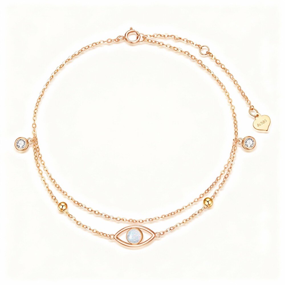 Vergroot uw stijl met onze prachtige 14K Rosé Gouden meerlaagse Charm Anklet, ontworpen voor de moderne vrouw die elegantie en charme omarmt. Deze verbluffende enkelband heeft een harmonieuze mix van sprankelende Cubic Zirconia, stralende Opal en speelse kralen, aangevuld met een verleidelijke Evil Eye charm, waardoor het niet alleen een mode-statement is, maar ook een beschermend symbool.