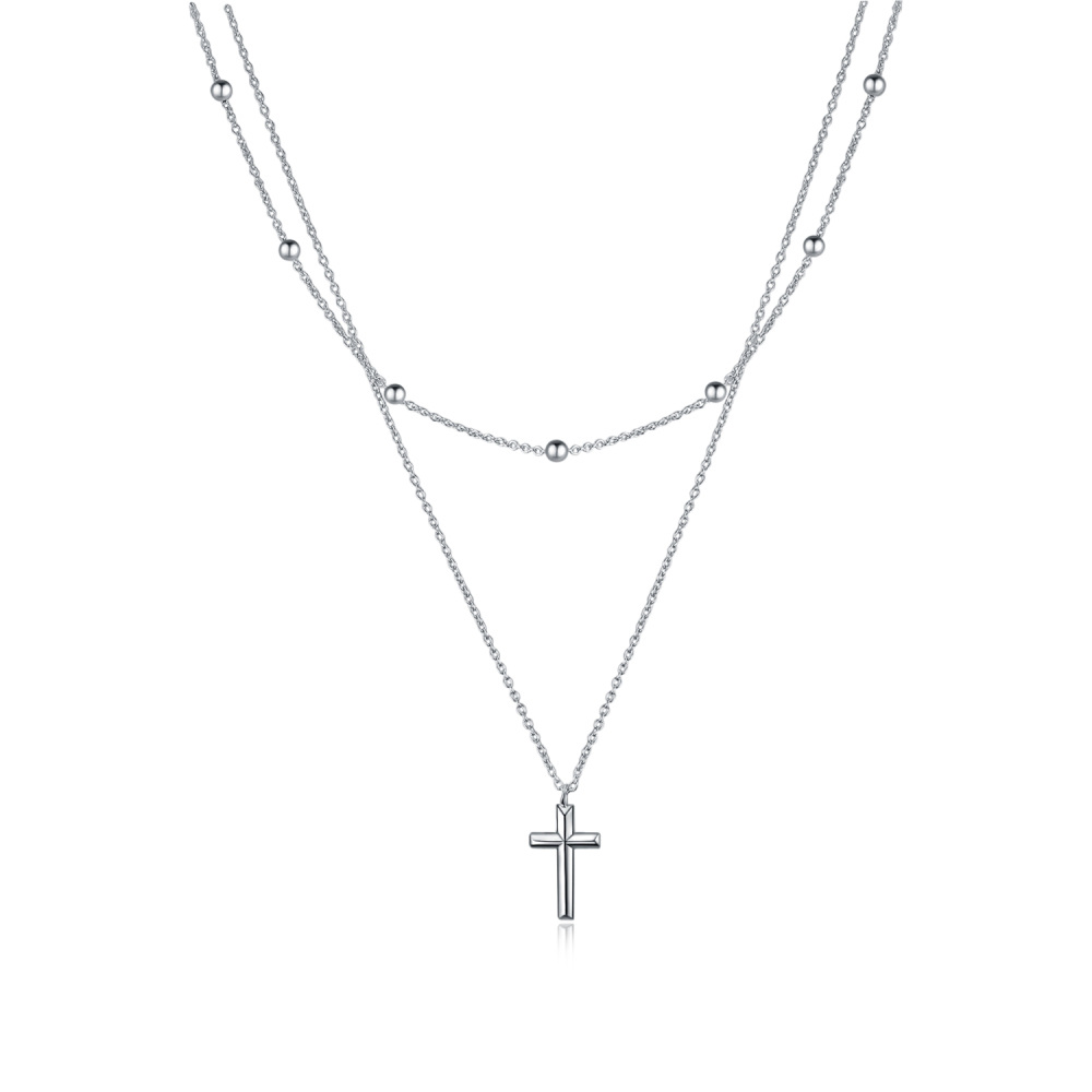 Ontdek onze elegante sterling zilveren gelaagde ketting speciaal ontworpen voor vrouwen, met een tijdloze kruis hanger en afgewerkt met een prachtige witgouden plating.
